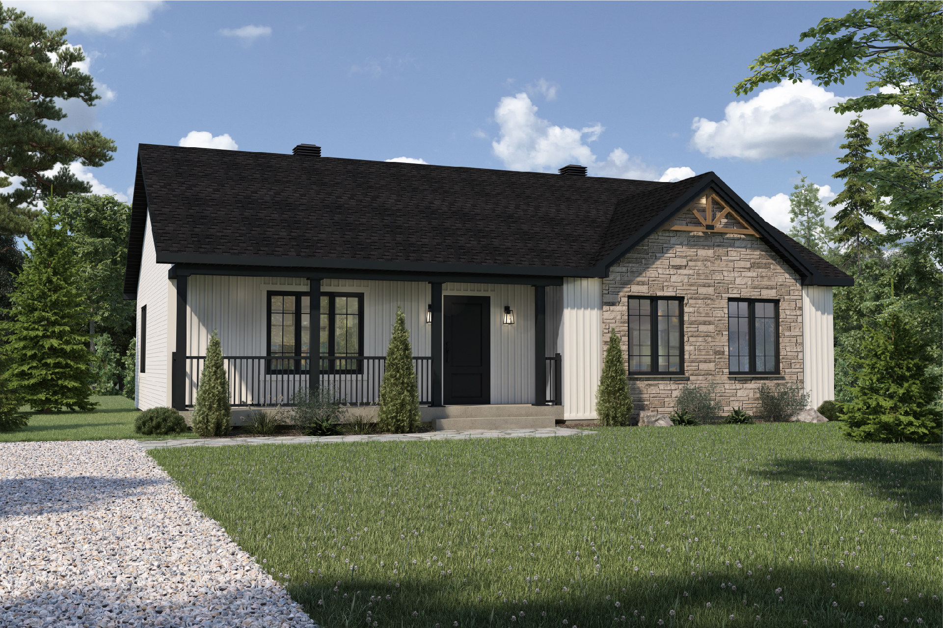 Maison champêtre de plain-pied, la Clair de lune charme par sa grande galerie couverte à l’avant.